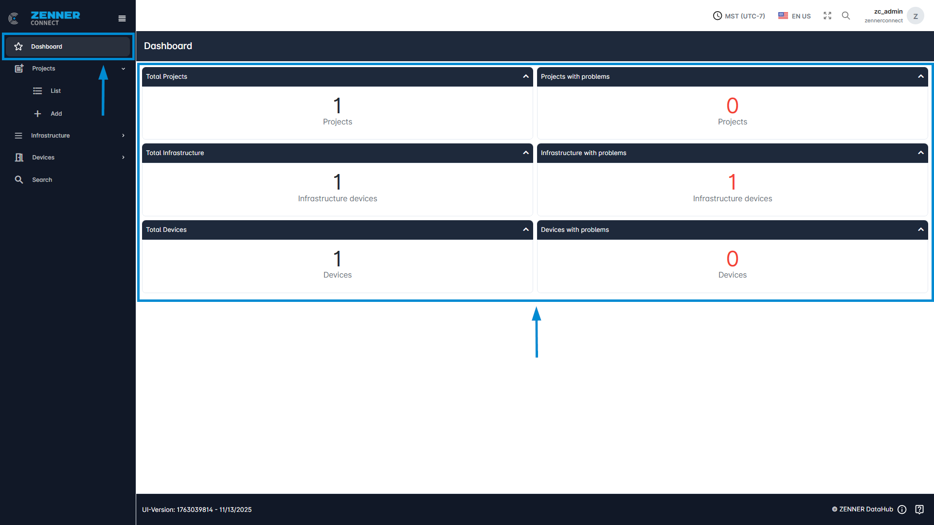 The dashboard is the first page that is called up after logging into the ZENNER Datahub. It gives you a general overview over your tenant with the following information: