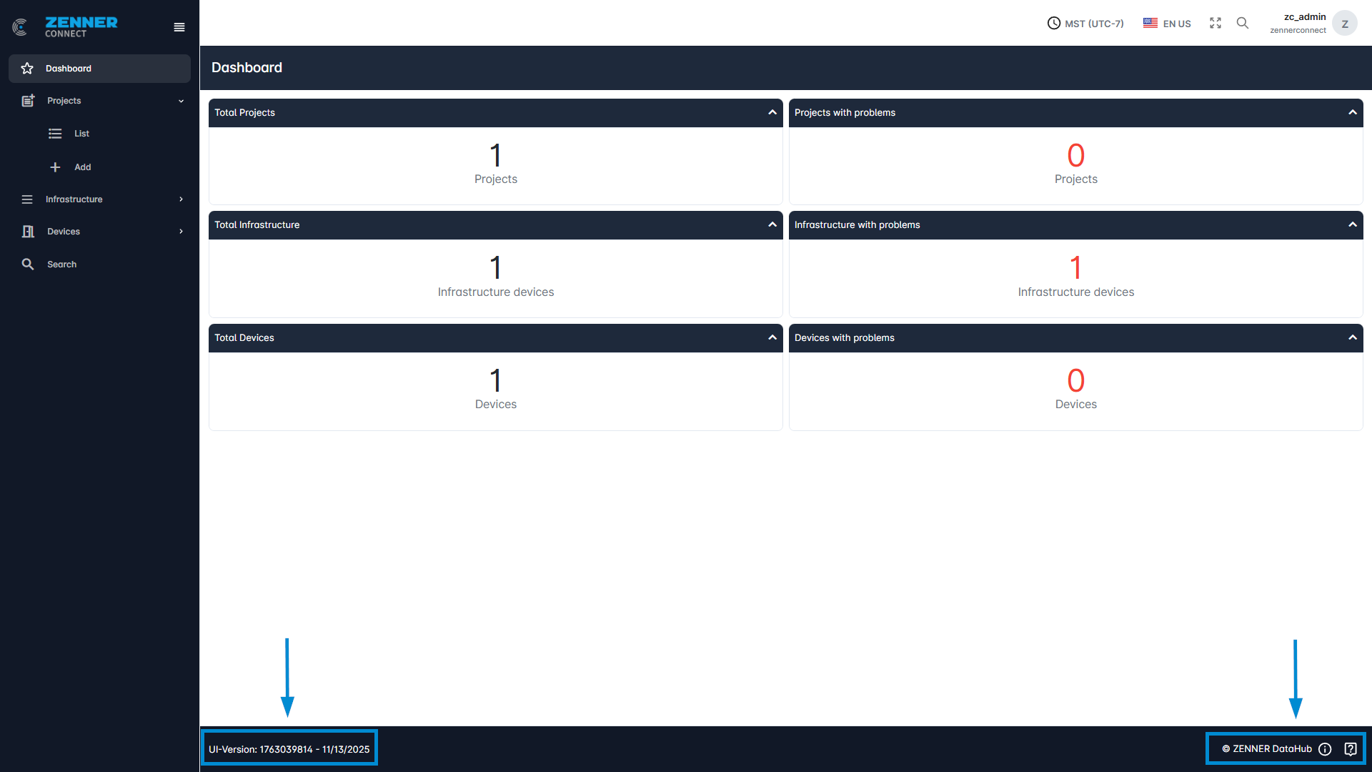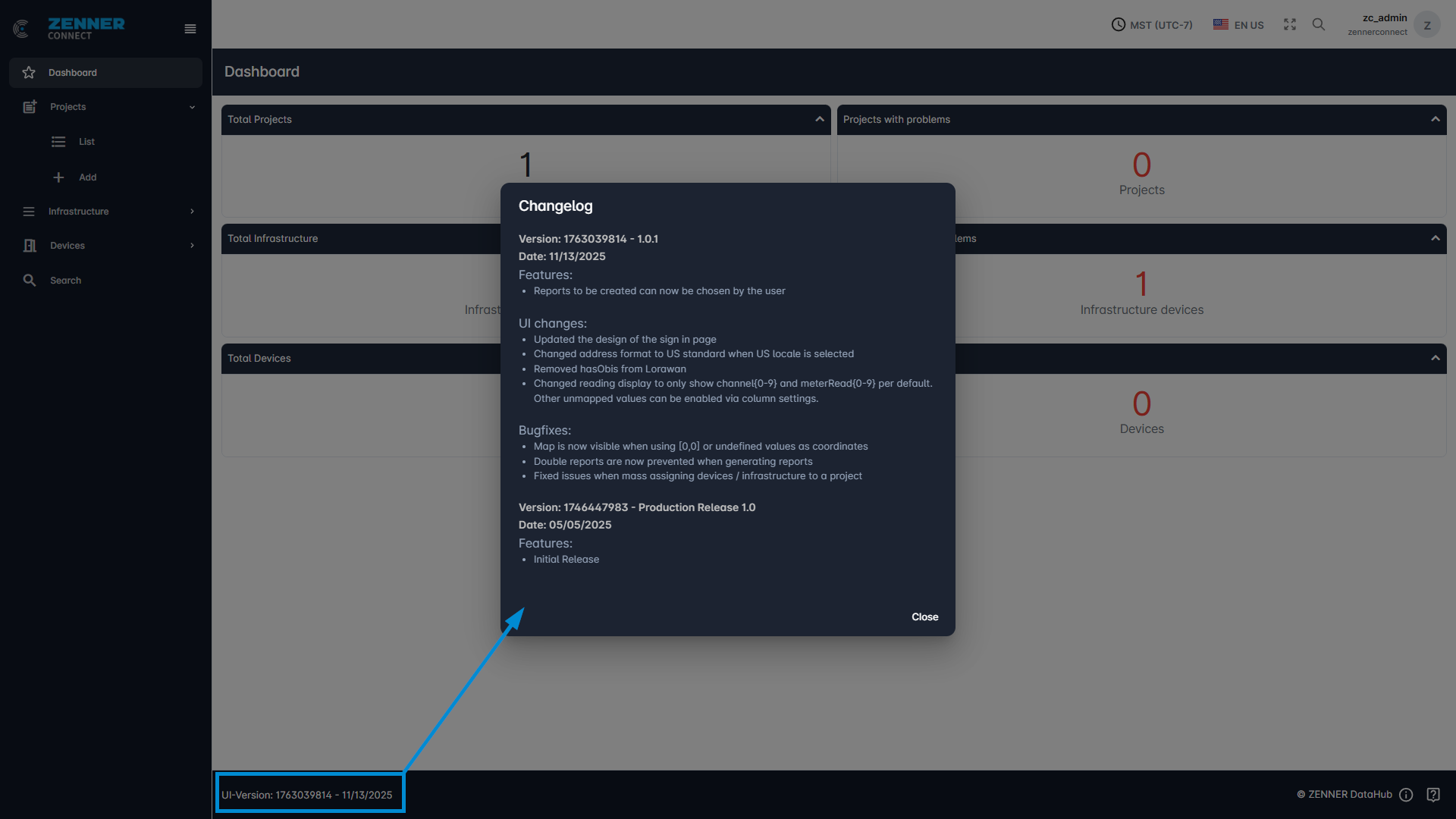 Furthermore, at the bottom, the current UI version is displayed on the left. Clicking on it displays the recent changelog. And on the right, you will find links to the ZENNER Datahub User Guide and the ZENNER Connect Service Desk, accessible via the exclamation mark and question mark symbols respectively.