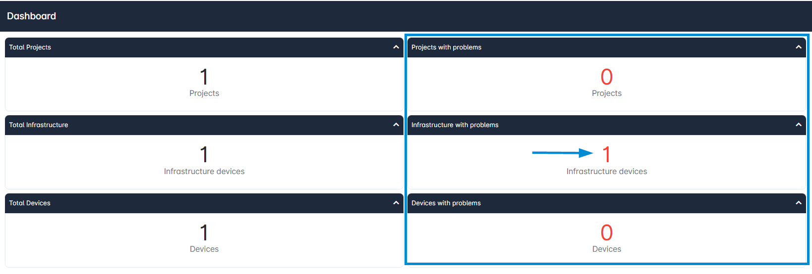 If there are any projects, infrastructure devices, or devices with problems, you can simply click on the respective number to see the list and take a closer look. In the following example, you would land on the Infrastructure List with the corresponding filter “Infrastructure with problems”, activated.