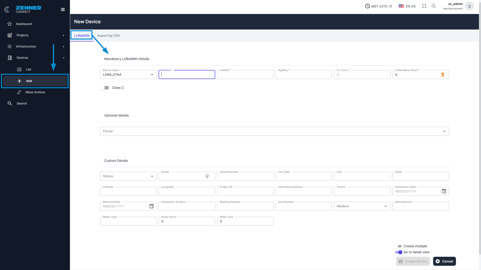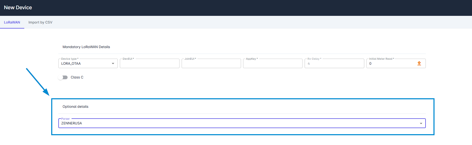 Parser | The parser is selected here, for ZENNER & UDC Devices it must be ZENNERUSA |