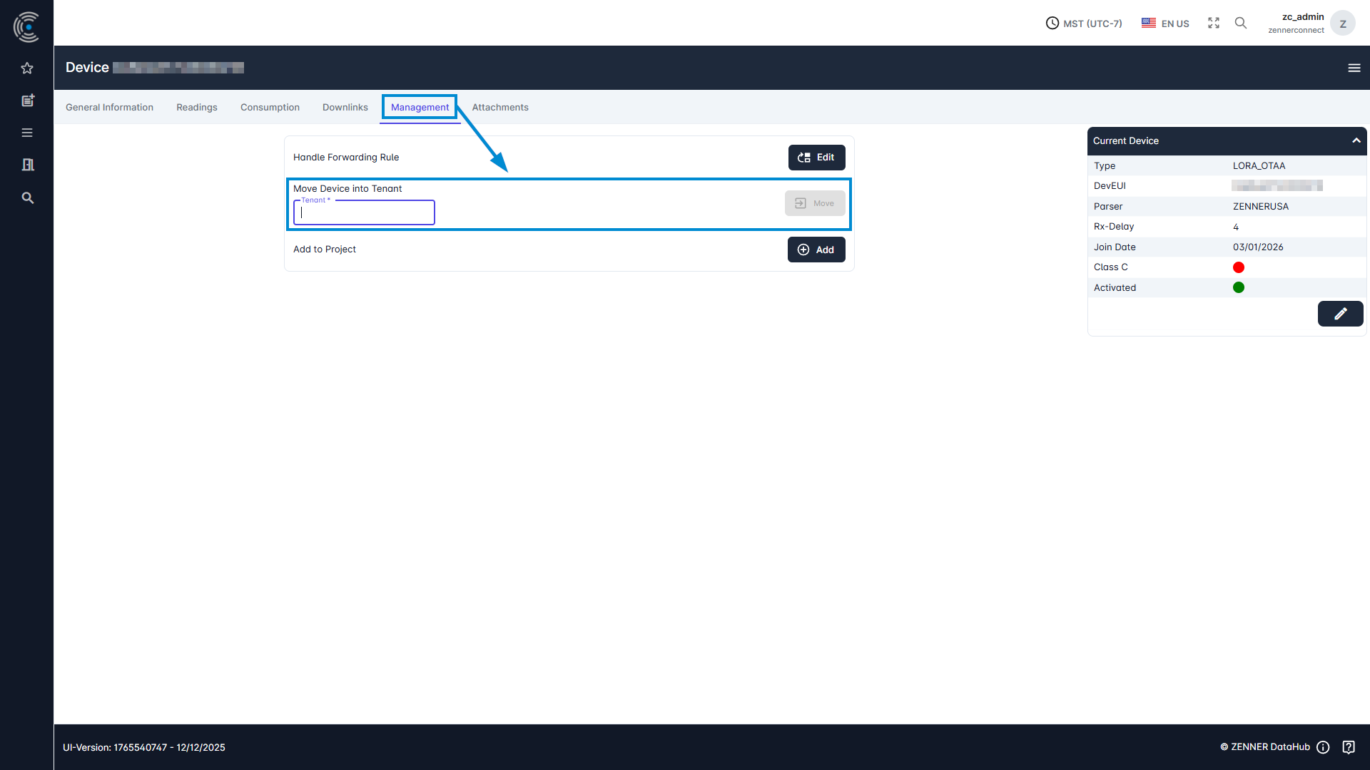 If you have the needed permissions with your Datahub user, you can also move a device into another tenant to which you also have access to. To do this, go into the tab “Management” of the relevant device, enter the name of the target tenant, and click the “Move” button.