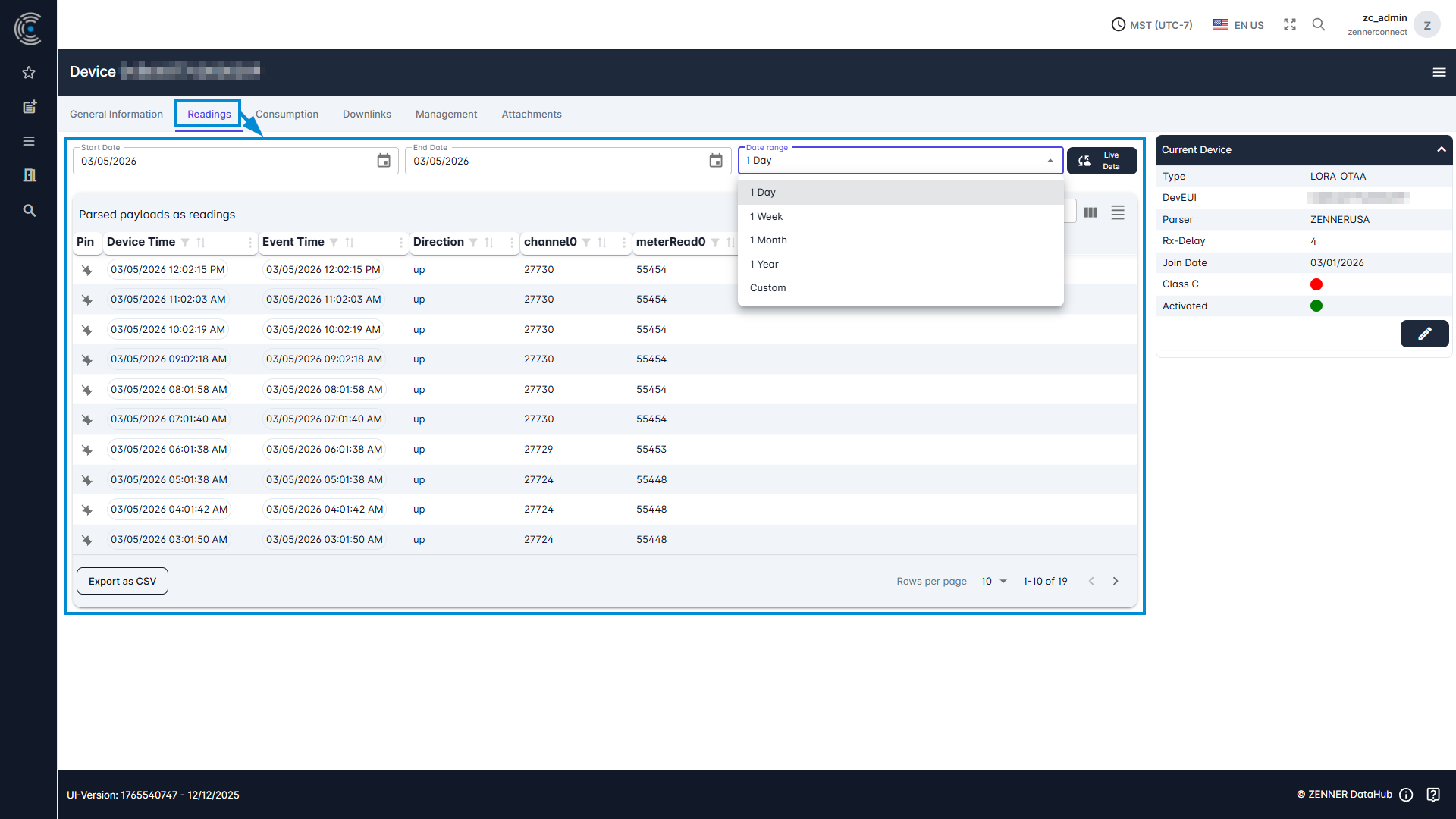 To display the readings of a meter/sensor, select it via the “Device List” and then go to the tab “Readings”.