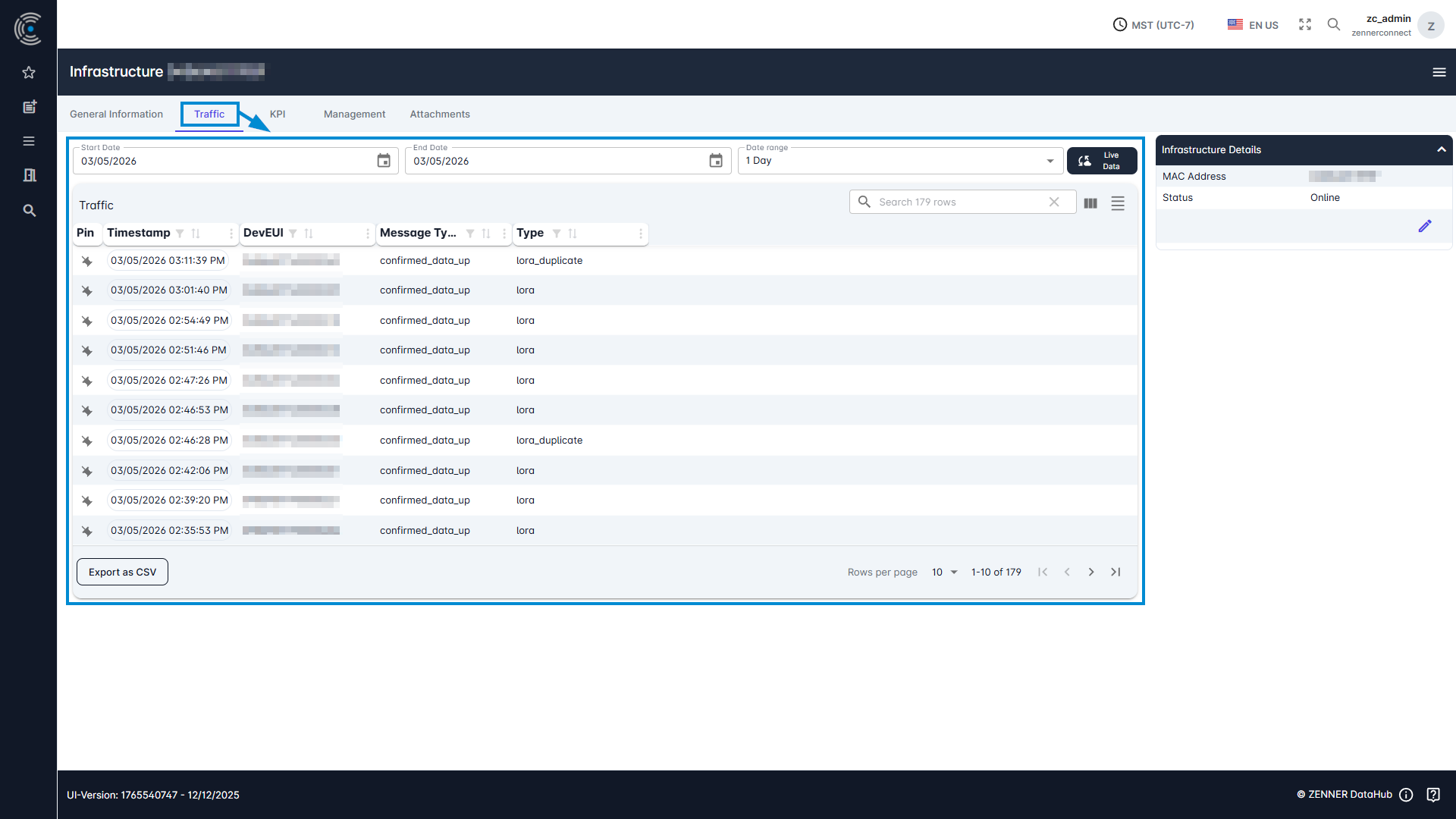 Various data on the LoRaWAN traffic received is displayed here in a table, where you also have several options for searching and filtering.