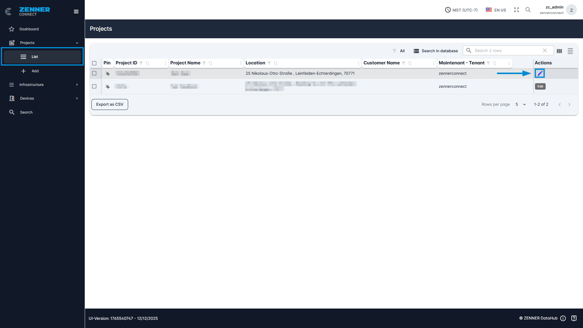 Another option for editing an existing project is to use the “Edit” button directly on the project list next to the relevant project.