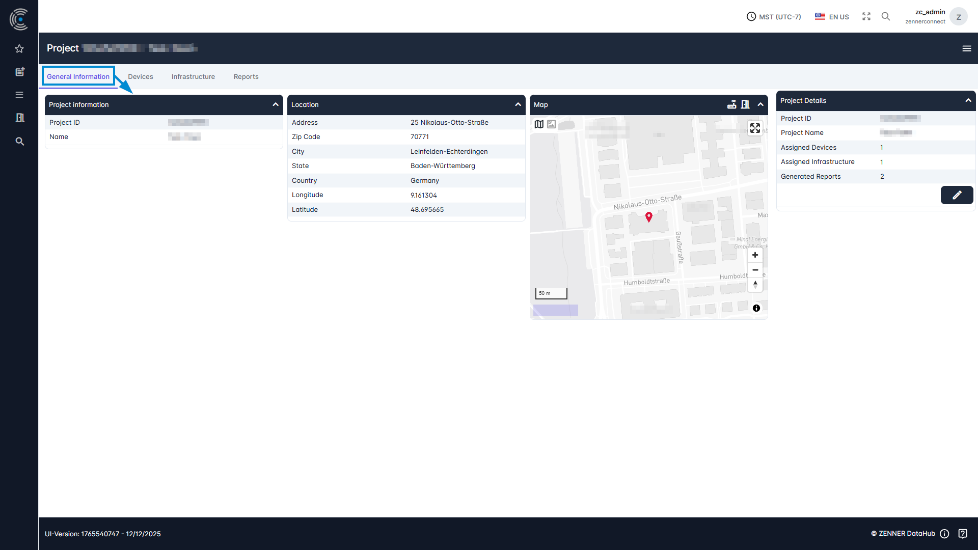 To view the respective general information of a project, open a project in the Project List by simply clicking on it. The tab “General Information” is then the first view after opening a project. This includes project information (project ID, name) and if given, location information (address, zipcode, city and country).