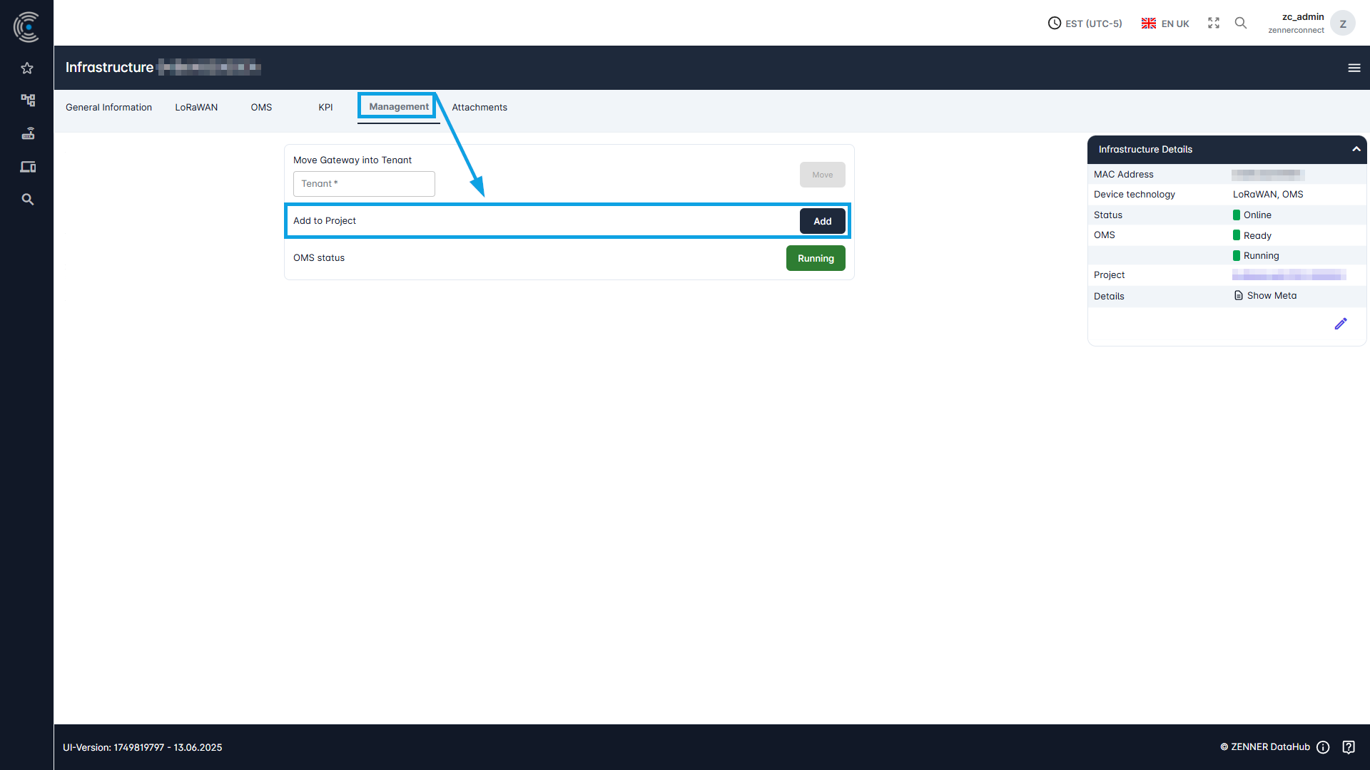 To assign infrastructure to a Project, go into the tab “Management” of the relevant infrastructure component and click there on the respective “Add to Project” button.