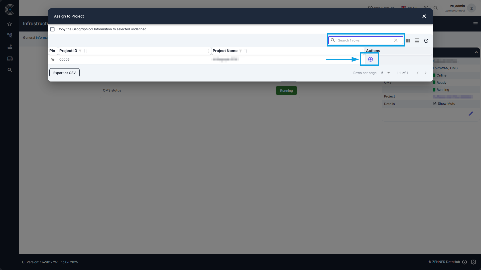 Select the relevant project you want to assign the component to from the shown list and simply click on the “+” button next to it. The infrastructure component is now assigned to the respective project.