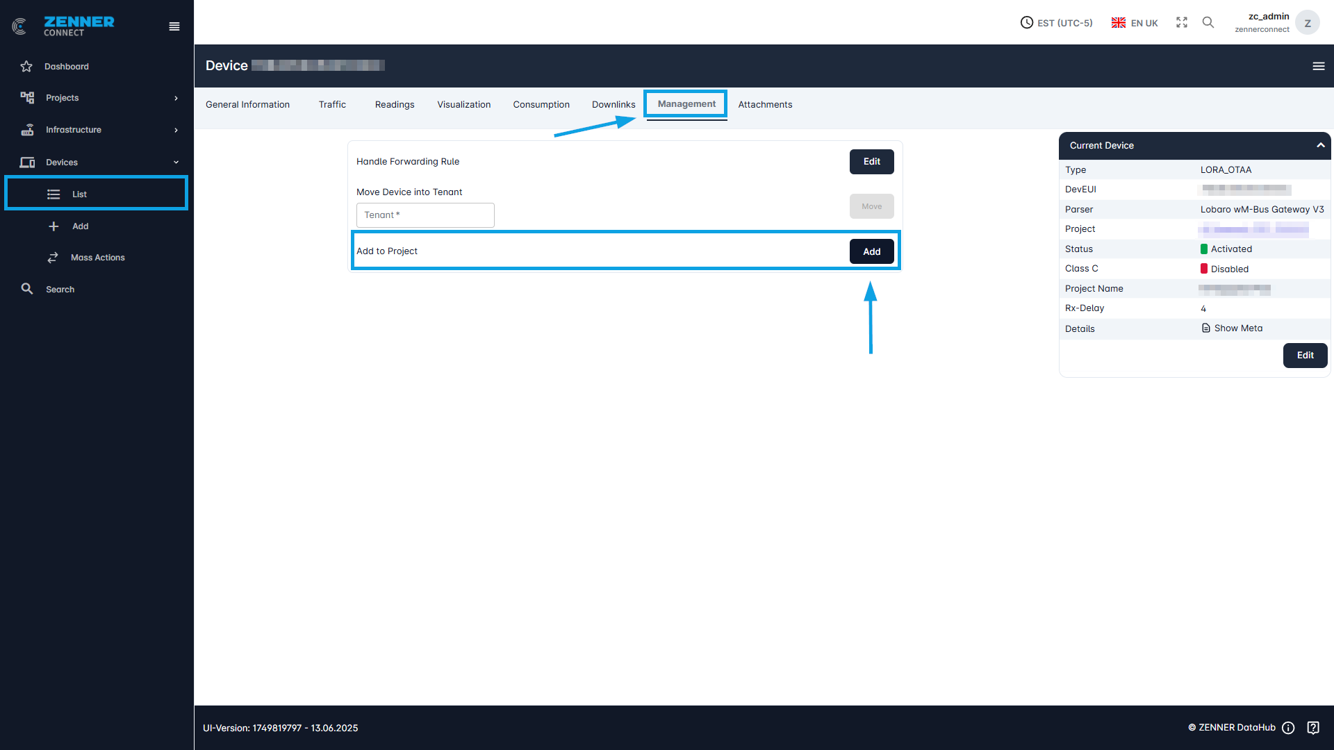 3rd option: Select the device from the Device list and click on it. Under the “Management” tab on the Device Page there is the “Add to Project” button, select the project there and then click on the “+” button under Actions. The device is now assigned to the project.