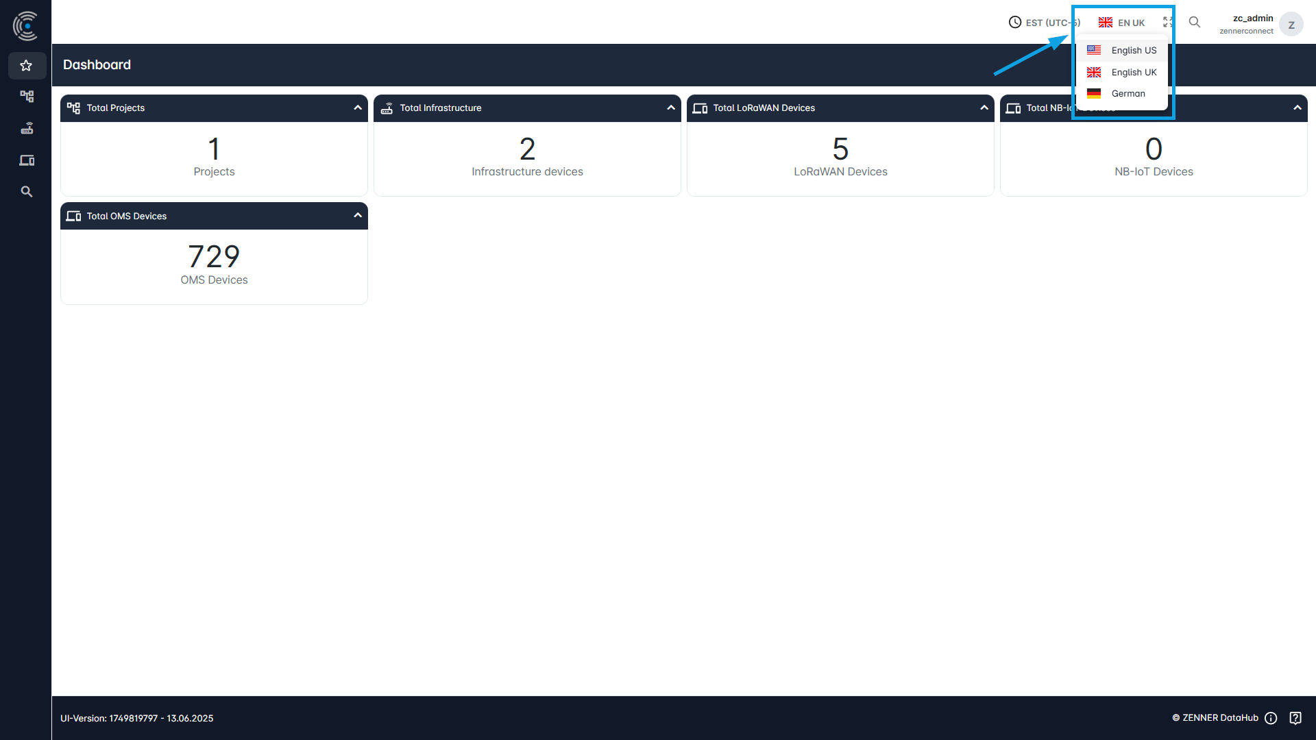 To change the language, click on the flag icon in the top right-hand corner, right to the time zone switch. Here you can choose between the available languages, which are currently: