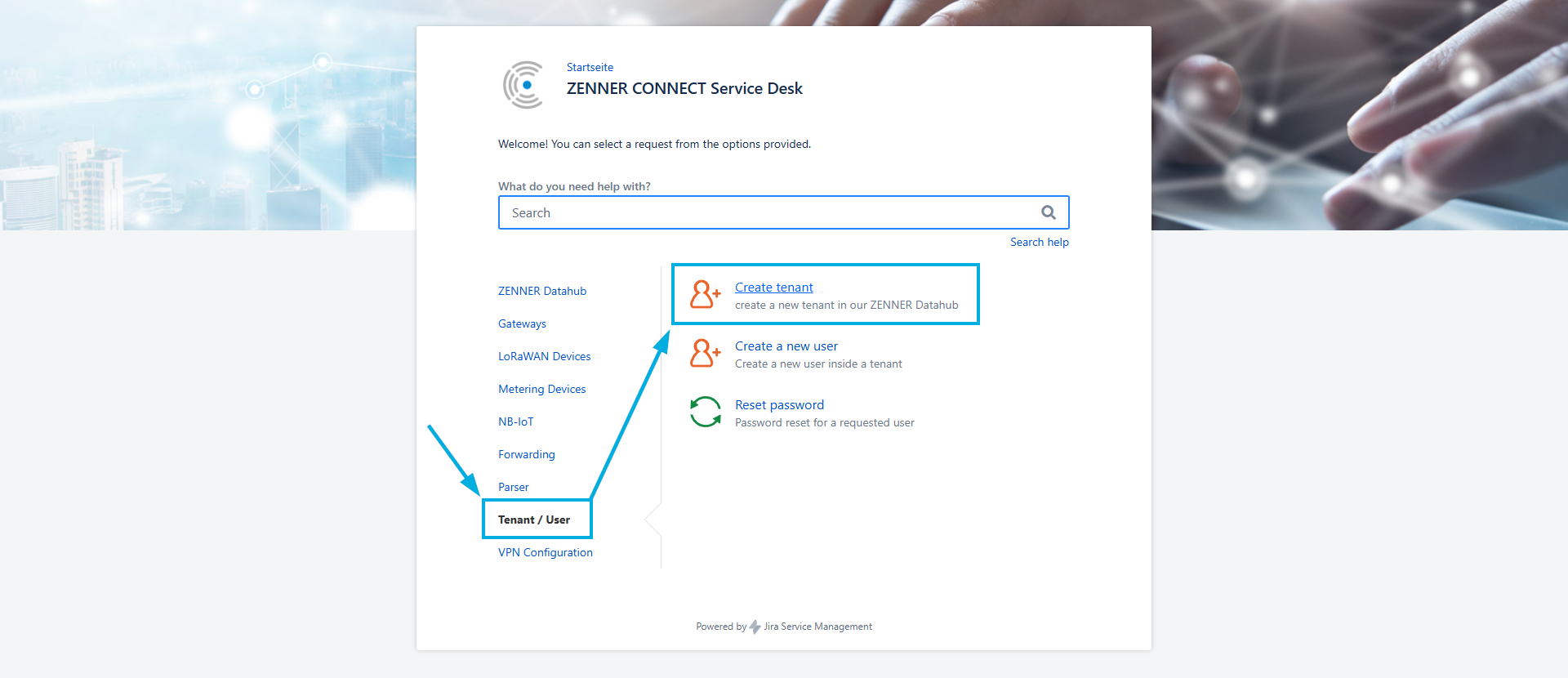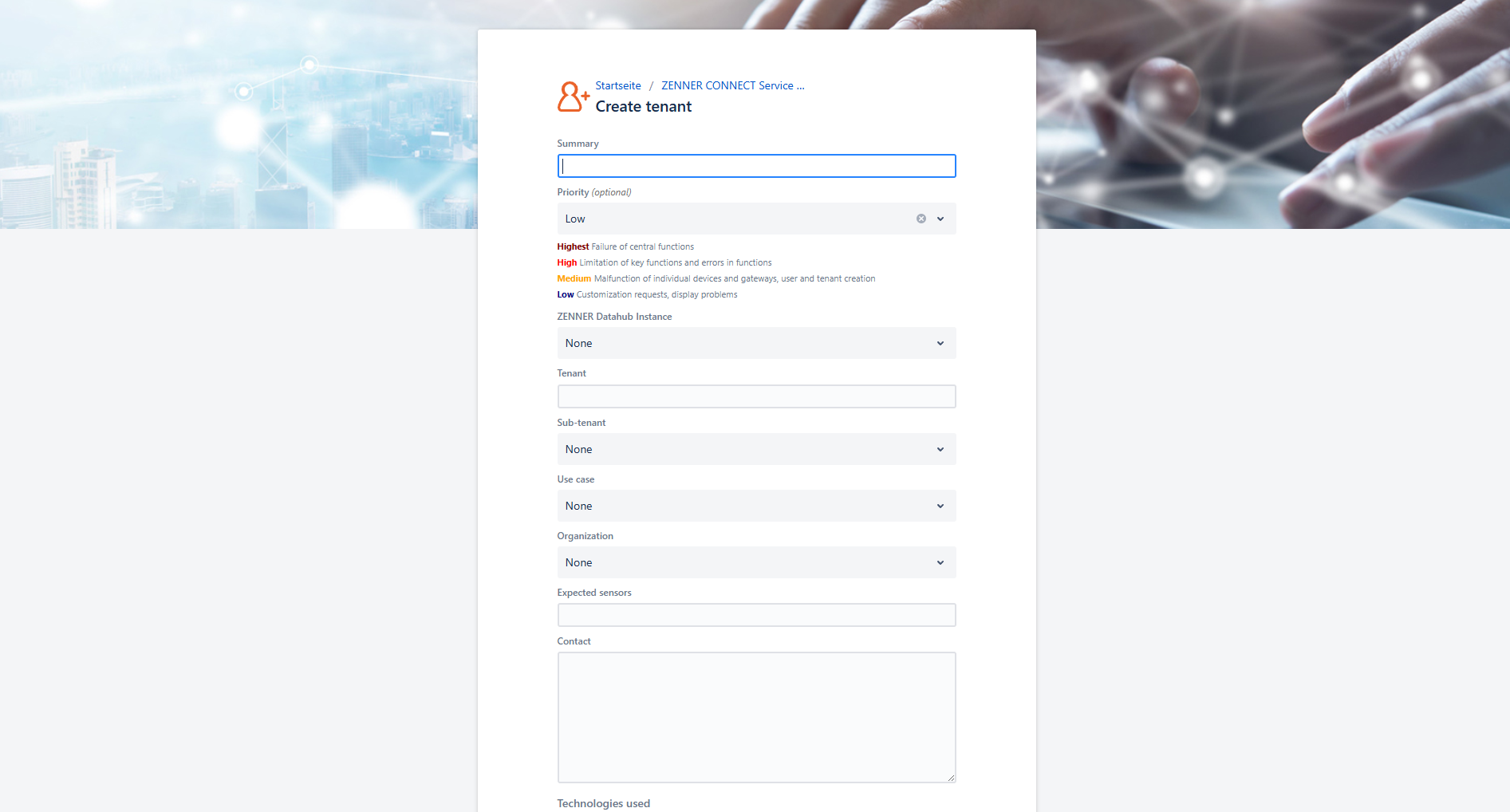 new tenant can only be created by the ZENNER Connect Team itself and must be requested by email or by creating a ticket in the ZENNER Connect Service Desk with the following required information: